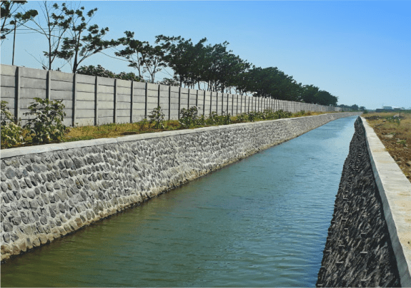 Drainage System 8-10m width discharge, 2,5m above floodlevel, retention pond 420.000m3